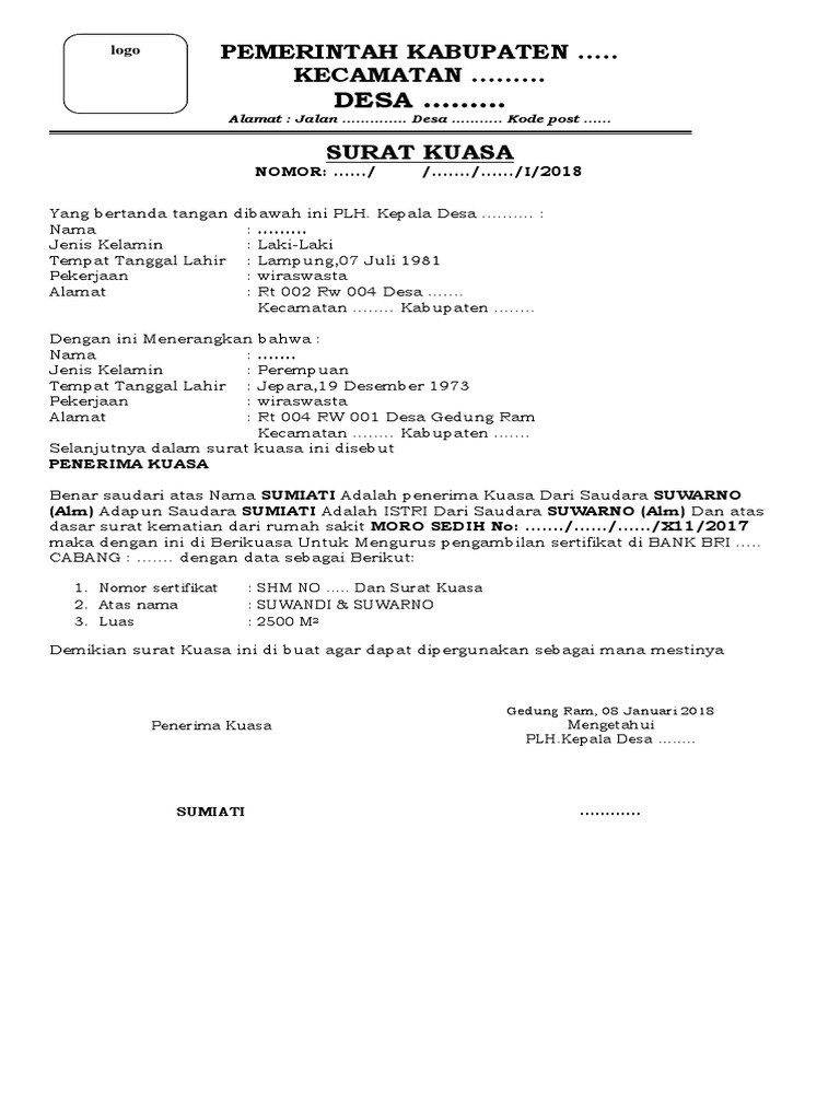 Contoh Surat Kuasa Dari Kepala Desa