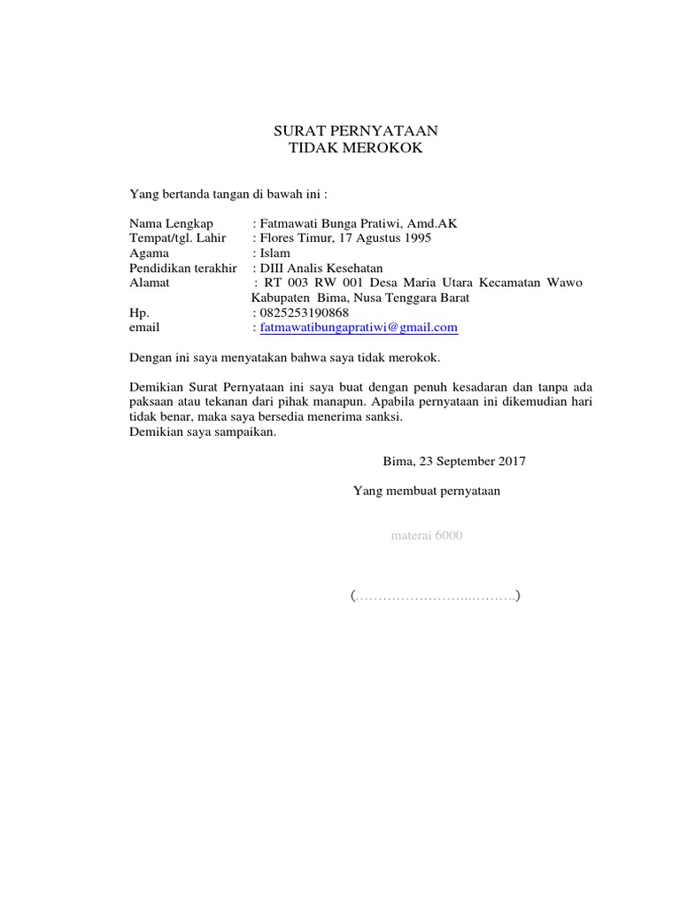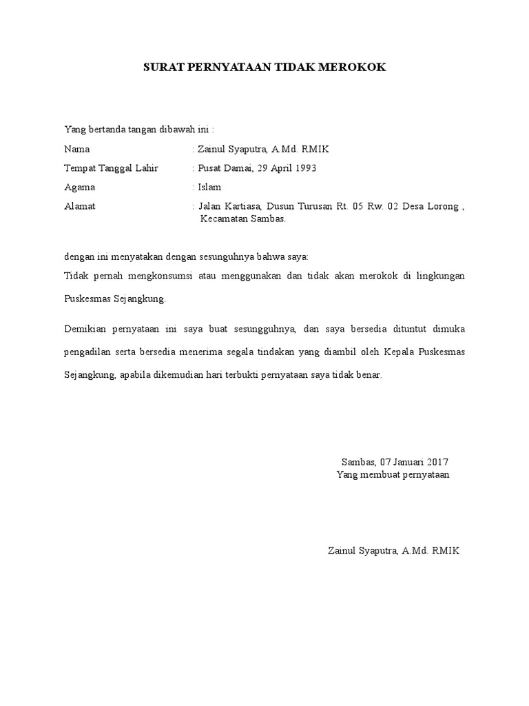 N I M. Contoh Membuat Surat Pernyataan Tidak Merokok. Terima Kasih sudah mengunjungi dan membaca artikel semoga artikel ini dapat bermanfaat untuk Anda sobat kalau dirasa belum cukup Anda bisa juga bisa berbagi artikel ini ke Kerabat Keluarga Sahabat Sampai teman di media sosial juga bisa Anda share D.