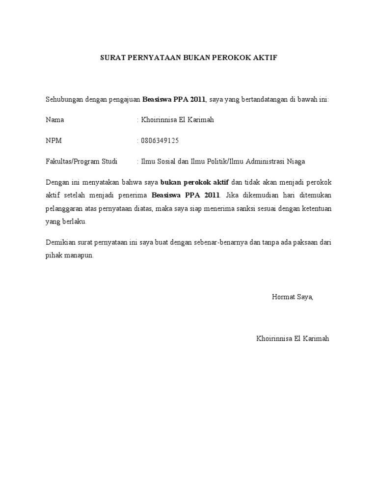 Surat Pernyataan Tidak Merokok Formulir Ppa