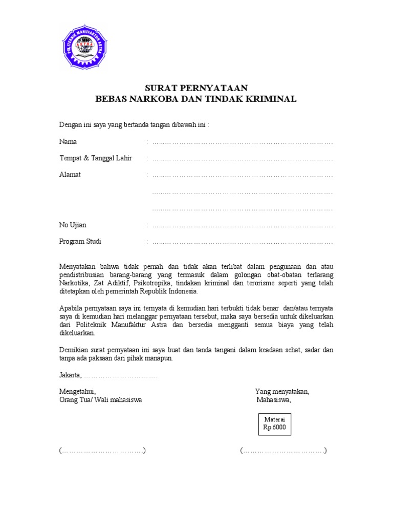 1Surat Pernyataan Tata Tertib 2Surat Pernyataan Bebas Narkoba 3Surat Pernyataan Pengumpulan Ijazah yang telah diisi dan ditanda tangani di atas materai. Contoh Surat Pernyataan Bebas Narkoba dan Tindak Kriminal Pribadi. Cara Buat Dan Contoh Surat Keterangan Bebas Narkoba Alterra Bills.