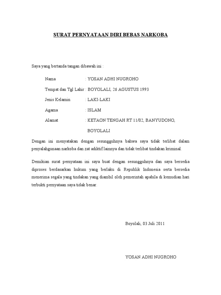 Dengan ini saya menyatakan bahwa saya tidak pernah dan tidak akan terlibat dalam penggunaan danatau pendistribusian Obat-Obat Terlarang. Alamat di Yogyakarta. Setelah itu dokter akan membuatkan surat keterangan apakah kamu bebas dari seluruh narkoba tersebut atau malah dinyatakan sebagai pengguna narkoba berdasarkan pemeriksaan 6 jenis narkoba di atas.