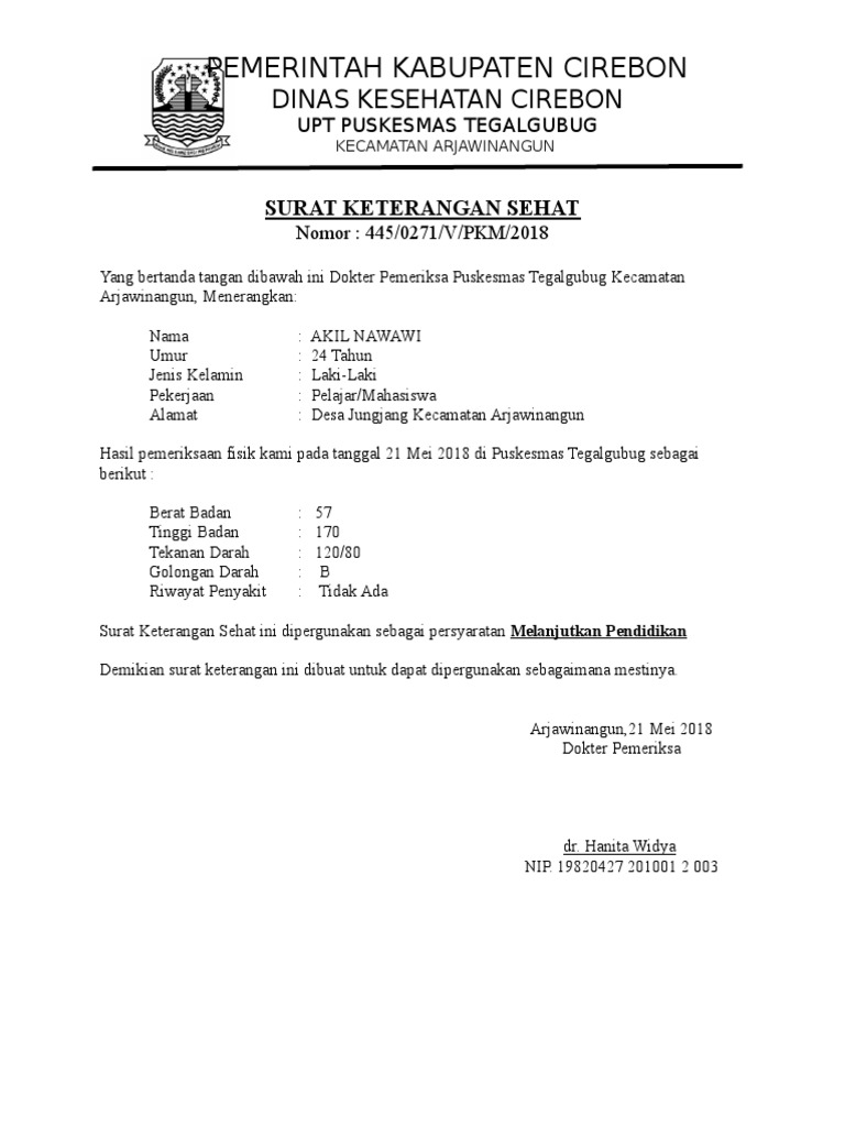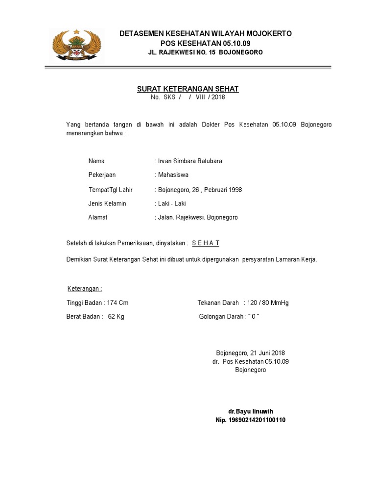 Download Contoh Surat Keterangan Sehat dari Dokter. Besar harapan saya agar BapakIbu Kepala PT GMC Aero Space Nusantara dapat menerima mahasiswa didik saya untuk magang di perusahaan BapakIbu. Surat Keterangan Sehat Dalam Bahasa Inggris Surat merupakan bentuk alam komunikasi baik itu formal maupun informal.