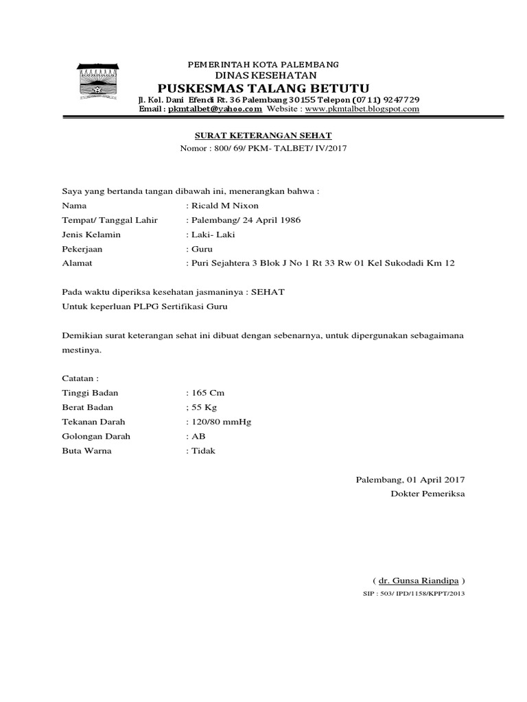Contoh Surat Keterangan Sehat Untuk Kuliah.
