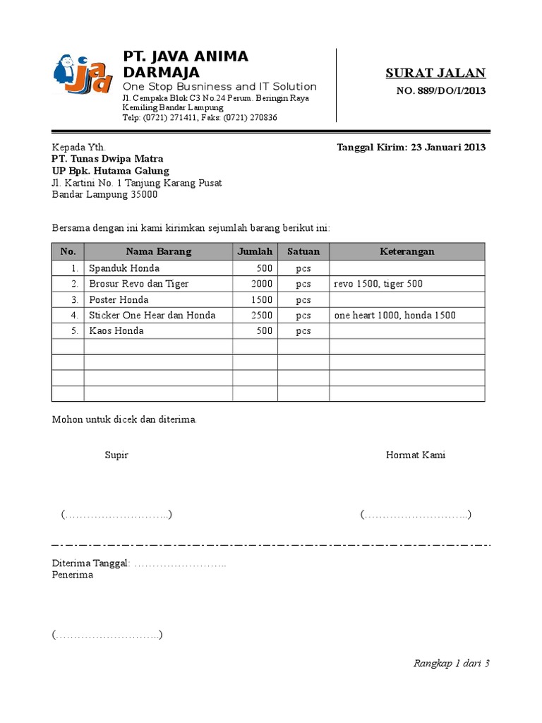 Contoh Surat Jalan Pengiriman Barang Nusagates
