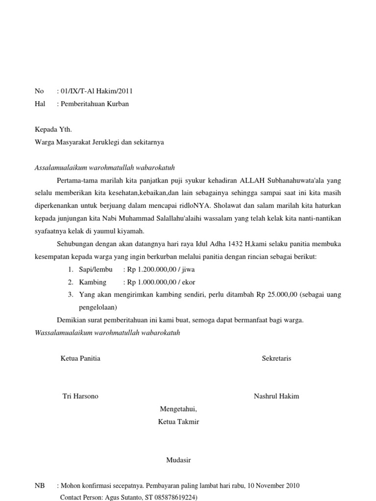 Contoh Surat Pemberitahuan Qurban Contoh Surat