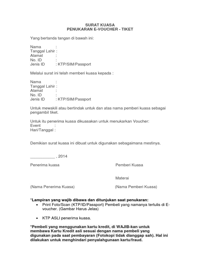 Surat kuasa ada banyak sekali jenis serta formatnya tergantung pada kebutuhan. Mencetak e-voucher di tempat penukaran akan dikenakan biaya tambahan.