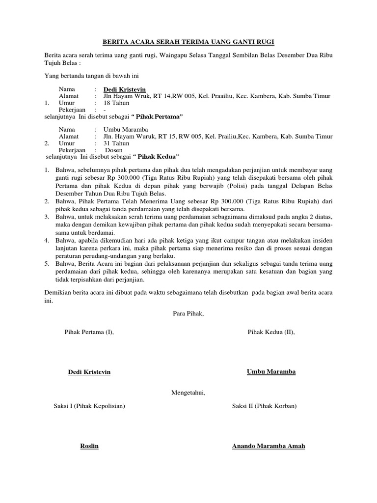 Dalam Contoh Berita Acara Ganti Rugi Gawe CV telah memilihkan tema atau template yang terbaik untuk dijadikan inspirasi ide ataupun acuan dalam penulisan surat anda. Contoh surat perjanjian singkat yang dibahas disini dibuat mengikuti surat perjanjian asli yang sah dan benar. The collection that comprising chosen.