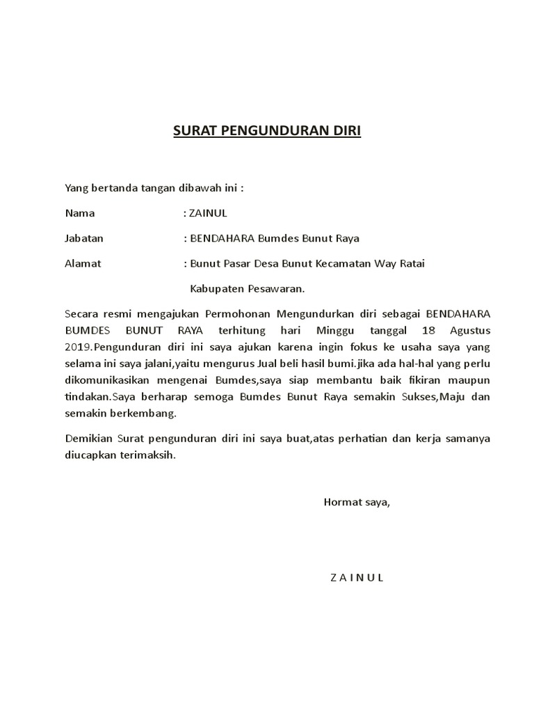 Contoh surat pengunduran diri bumdes terbaru. Surat pengunduran diri bendahara bumdes. Selain contoh surat pengunduran diri dari bumdes - lihat juga contoh gratis lainnya seperti. Last Updated 23 Juli 2021.